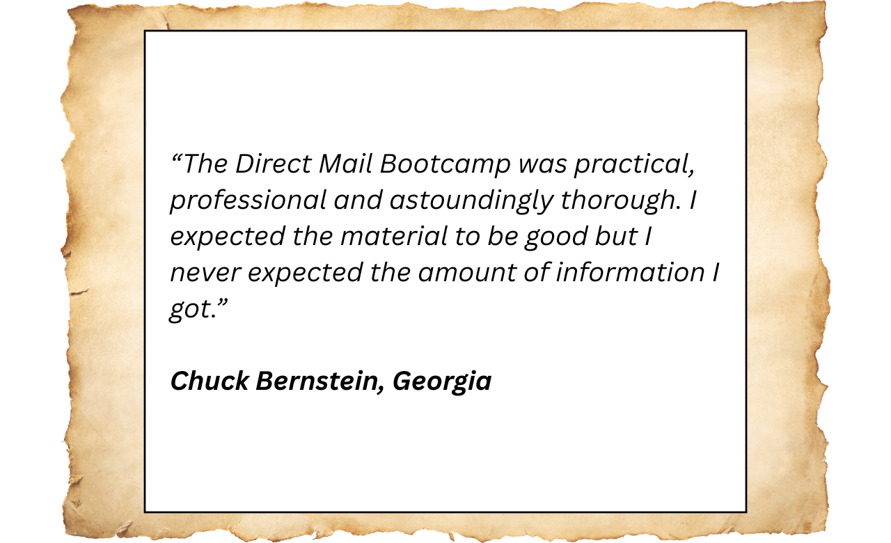 Anyway, those lucky enough to attend the Direct Mail Bootcamp realized very quickly that they were part of something very special. This was one of those amazing, profoundly life-changing events you sometimes read about in the biographies of people who have made it big.