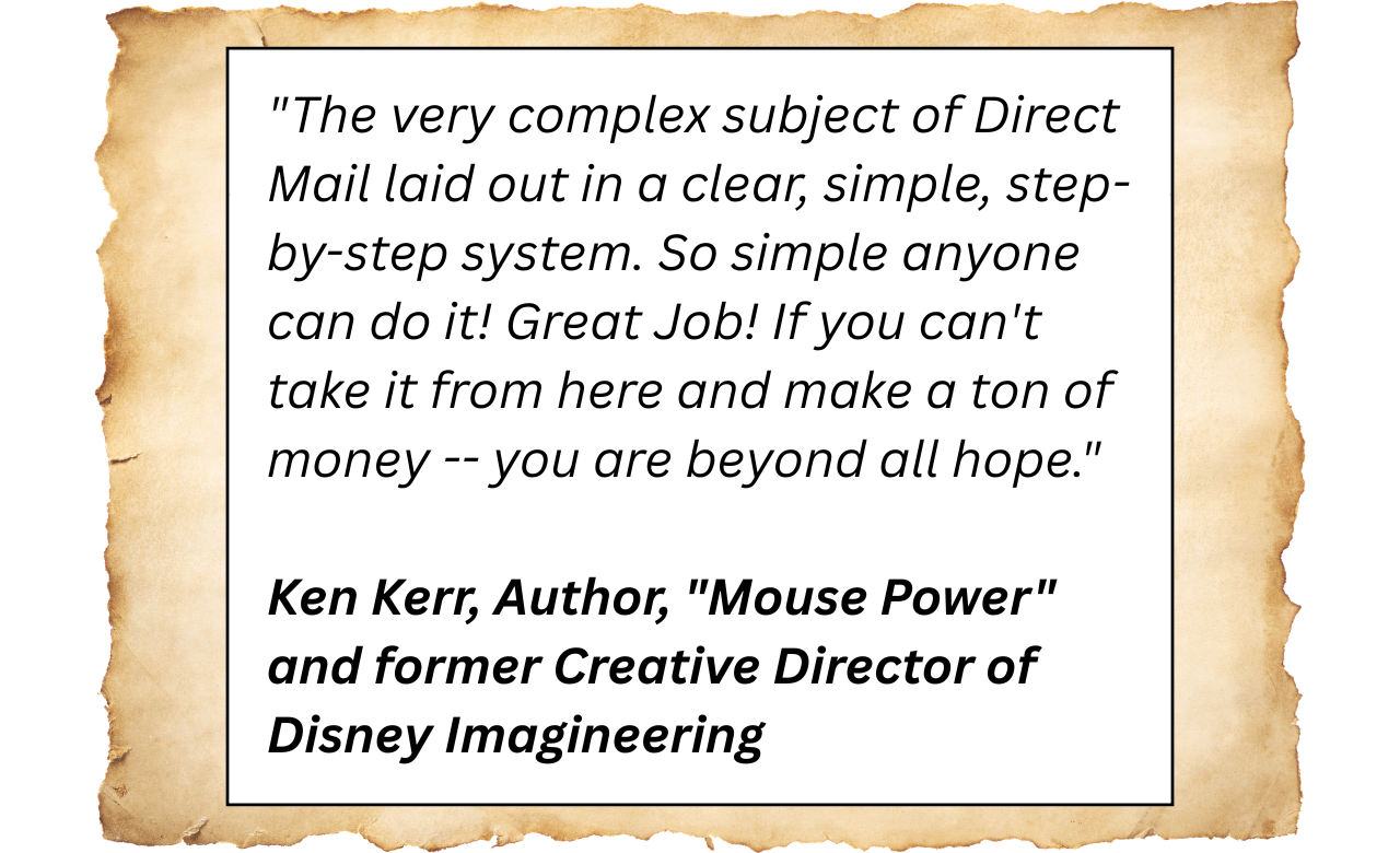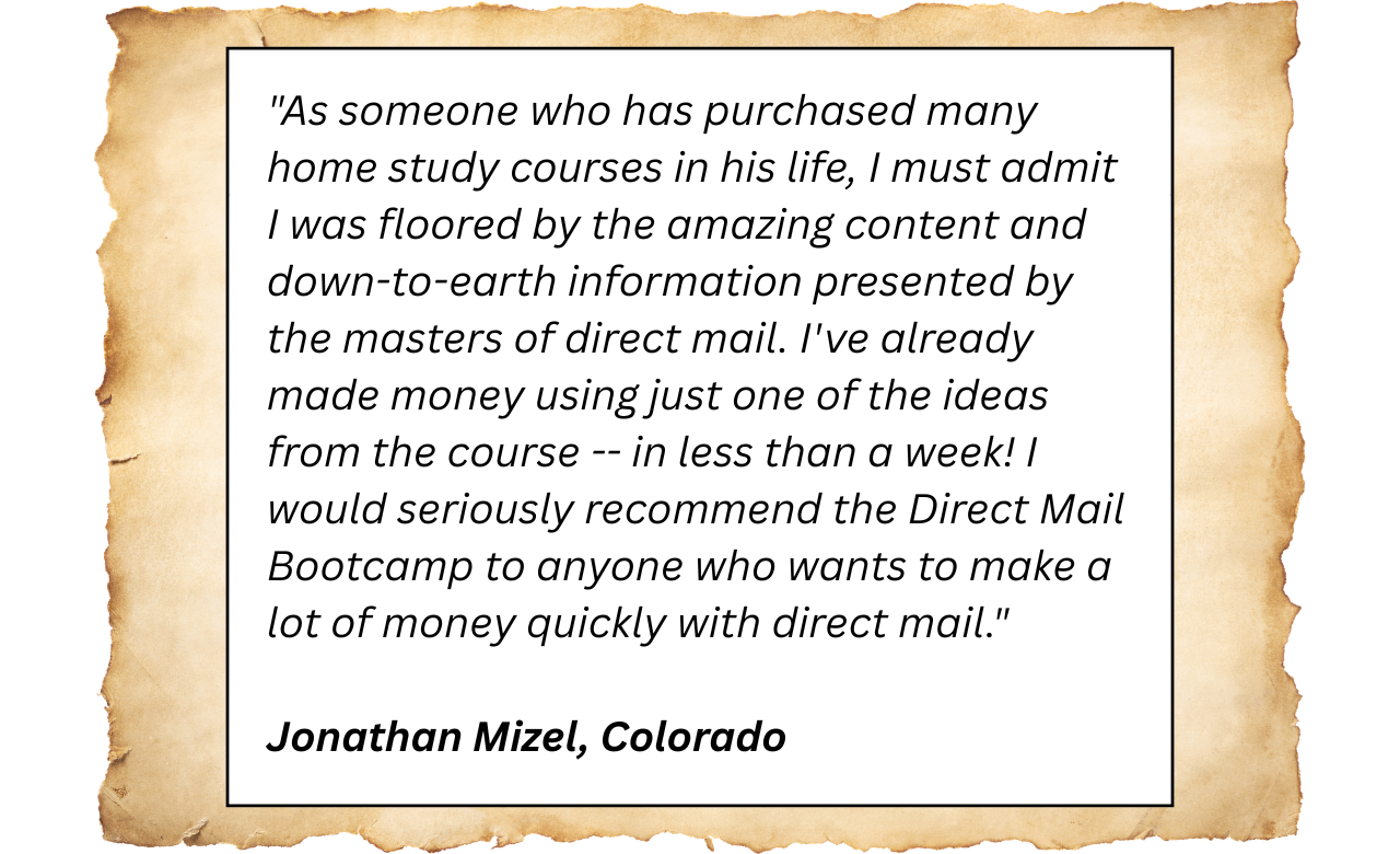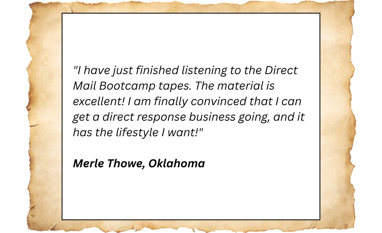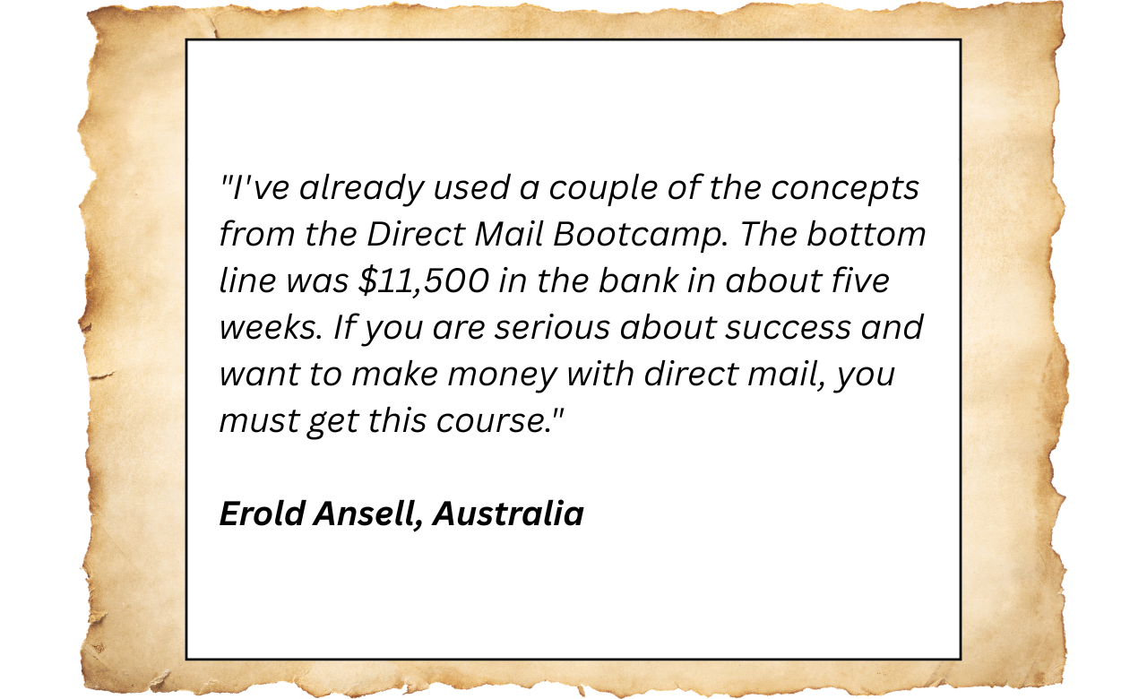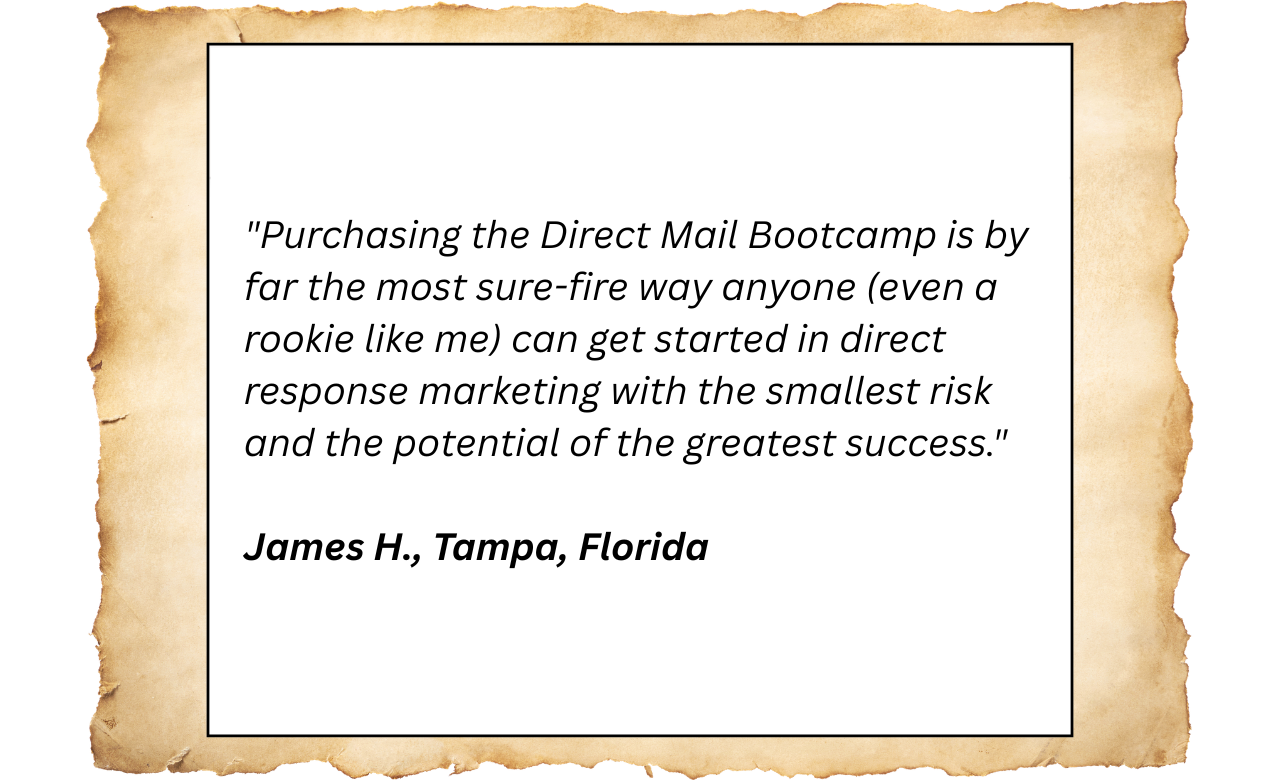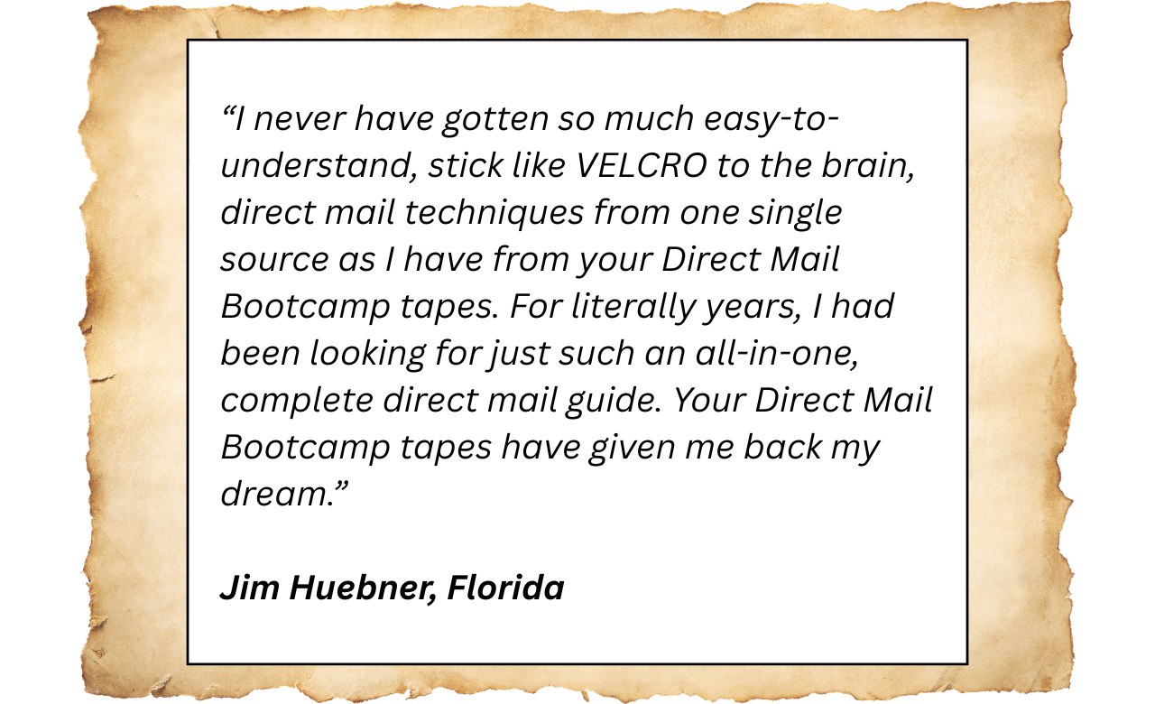 But if you know, and use, the amazingly simple, straightforward "Recipe for Success in Direct Mail" (as revealed at the Direct Mail Bootcamp), you’re going to discover it is easy to make money with direct mail ventures.